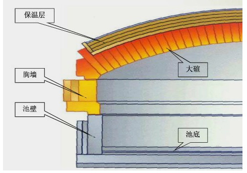 池底保溫:整體性性強(qiáng)的復(fù)合保溫結(jié)構(gòu),電熔AZS磚+鋯英石搗打料或電熔剛玉搗打料(耐磨層)+粘土磚(保溫層)+陶瓷纖維板2層30mm厚,錯縫層鋪(絕熱層)。